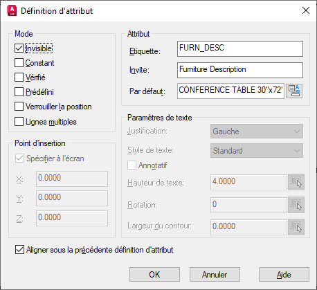 Remarque : Le mode invisible supprime la visibilité de l'attribut à l'écran et empêche que le dessin ne soit trop encombré, tout en offrant la possibilité d'ajouter des informations à un bloc. La visibilité des attributs masqués peut être activée ou désactivée avec la commande ATTECRAN.