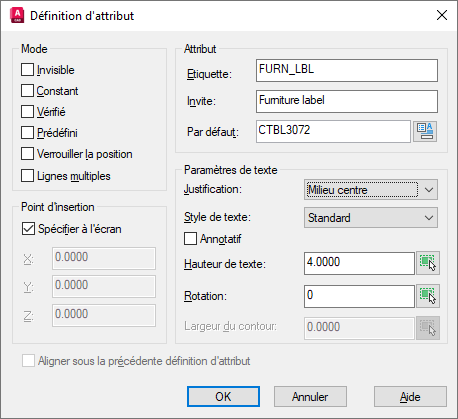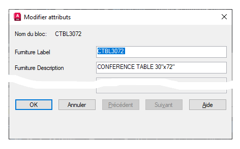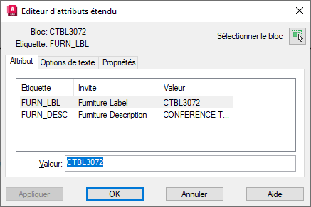 - Par défaut : remplace l'étiquette et correspond à la valeur affectée à l'attribut lors de l'insertion d'un bloc.