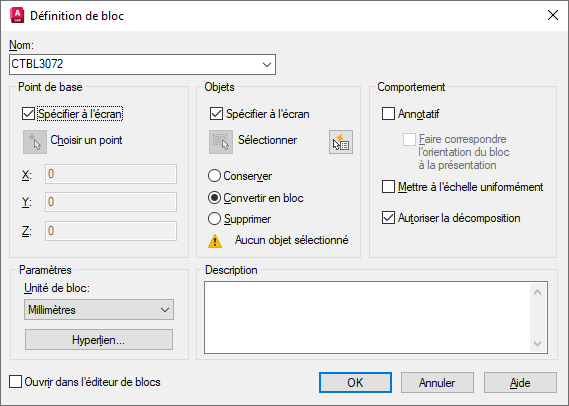 Les attributs, tels que la géométrie, peuvent être ajoutés à un bloc lors de sa création à l'aide de la commande BLOC ou version ultérieure lorsqu'elle est en cours de modification dans l'éditeur de blocs (commande MODIFBLOC).