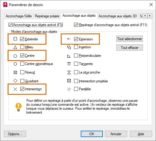 Je préfère l'intersection, le centre, le milieu et l'extrémité des accrochages aux objets actifs. La valeur du code binaire correspond alors à 1 + 2 + 4 + 64 = 71. Aussi, dans le moniteur de variables système, j'ajoute la variable OSMODE et lui attribue la valeur préférée 71.
