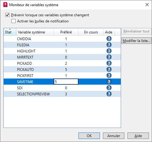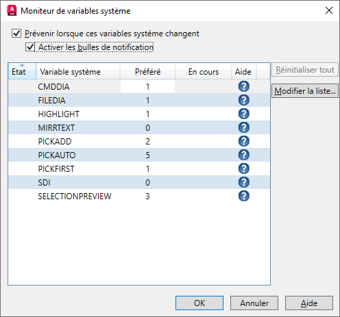 Sur la ligne de commande, saisissez MONITEURVARSYS. Dans la boîte de dialogue Moniteur de variables système, vous pouvez voir les variables système actuellement surveillées.