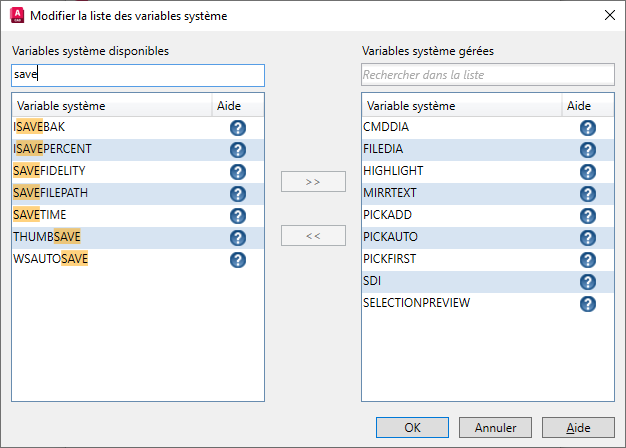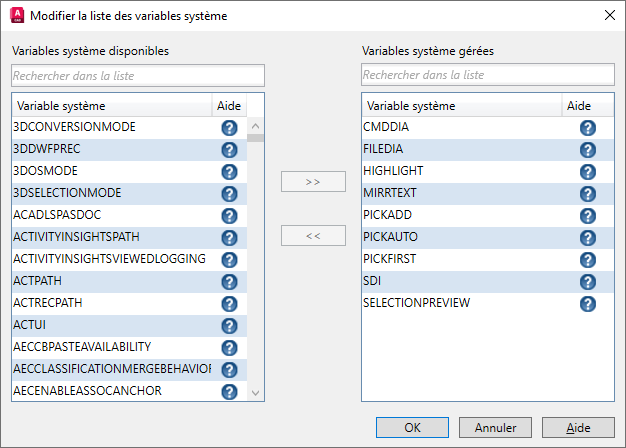 Toutes les variables système pouvant être surveillées sont affichées à gauche. Les variables système qui sont déjà en cours de surveillance sont affichées à droite. Cliquez sur ? à côté du nom d’une variable système pour ouvrir la rubrique d’aide associée.
