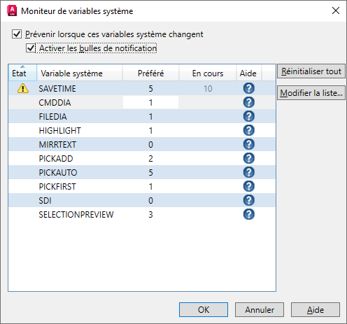Plutôt que de résoudre ces problèmes individuellement, il pourrait s'avérer utile de surveiller certaines variables système et d'être averti des modifications qui y sont apportées. Vous avez de la chance. Dans AutoCAD 2016, nous avons introduit le moniteur de variables système, conçu à cet effet.