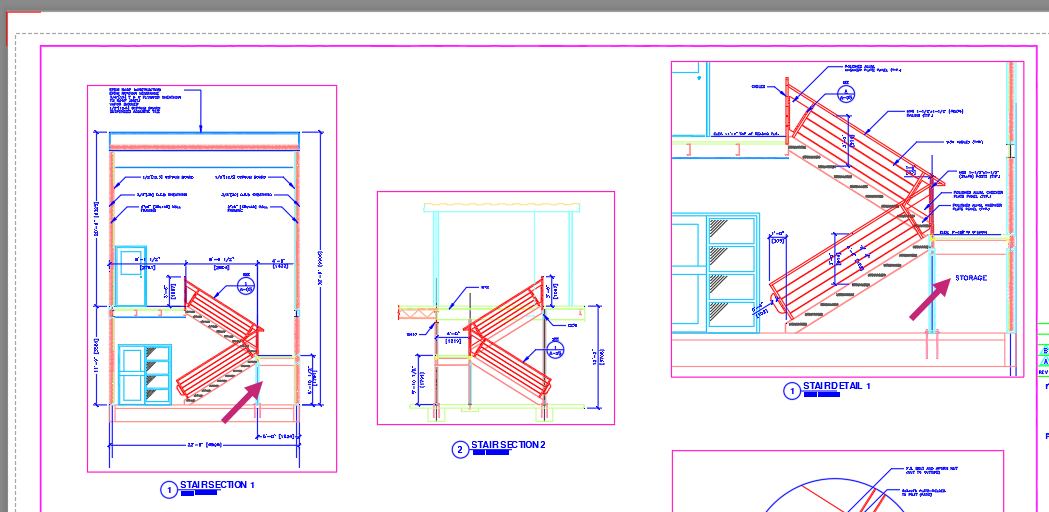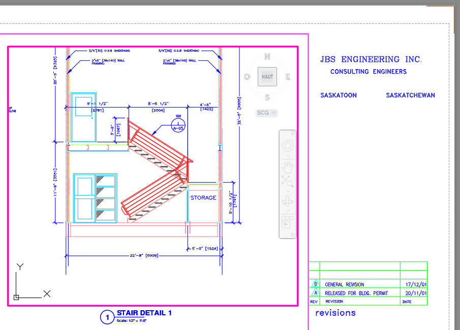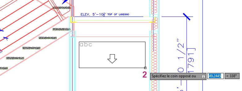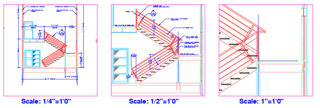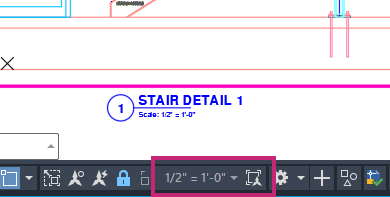 Le nouvel objet TextMult doit apparaître dans la fenêtre et s’appeler DÉTAIL D’ESCALIER 1, car l’échelle 1/2"=1'-0" lui a été affectée. Le texte ne sera pas affiché dans la fenêtre COUPE D’ESCALIER 1, car l’échelle 1/4"=1'-0" lui est affectée.