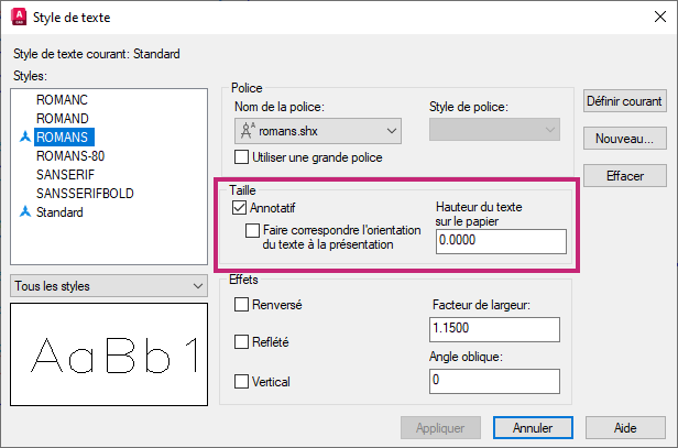 AutoCAD calcule et affiche automatiquement le texte à la hauteur nécessaire en fonction de la hauteur du texte sur le papier et de l’échelle d’annotation qui lui est affectée.