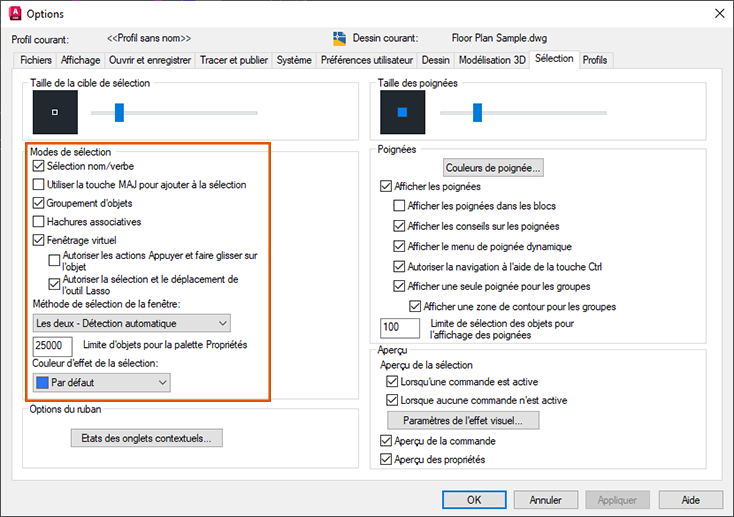 Sélection nom/verbe. (PICKFIRST) Assurez-vous que cette option est activée si vous souhaitez pouvoir sélectionner des objets en premier, puis sélectionnez une commande pour agir sur ce jeu de sélection.