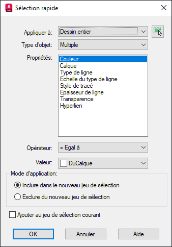 Remarque : L'option Nom correspond aux objets nommés tels que les noms de bloc, mais également au type d'objet des objets sans nom, tels que les lignes et les cercles.