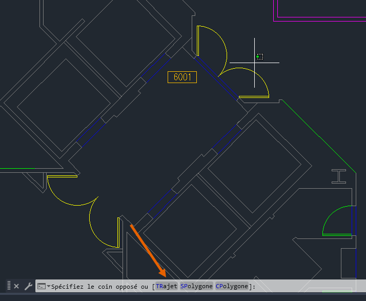 Polygone de capture : cliquez une fois pour commencer une sélection par fenêtre. Sur la ligne de commande, entrez cp pour un polygone de capture. Continuez à spécifier des points à l'écran. Les objets inclus dans la fenêtre de polygone de capture et qui la croisent sont sélectionnés.