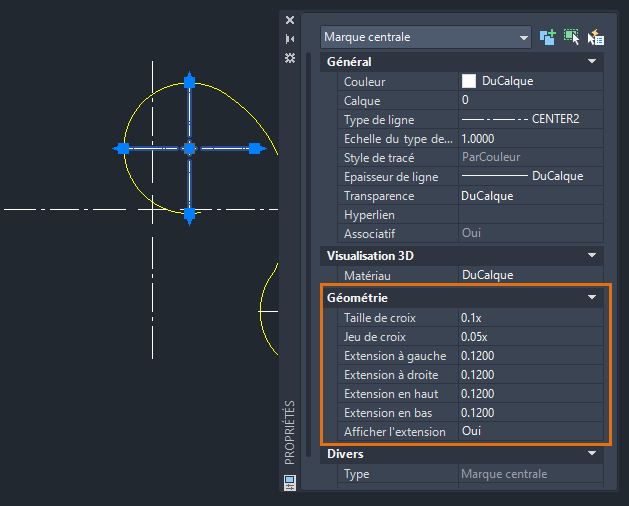 Les propriétés peuvent également être modifiées à l'aide de la palette Propriétés. Dans la palette Propriétés affichée, sélectionnez un point de centre ou un trait d'axe à afficher, puis modifiez les propriétés telles que la couleur, la taille de la croix, l'écart de la croix, la longueur de l'extension, etc.