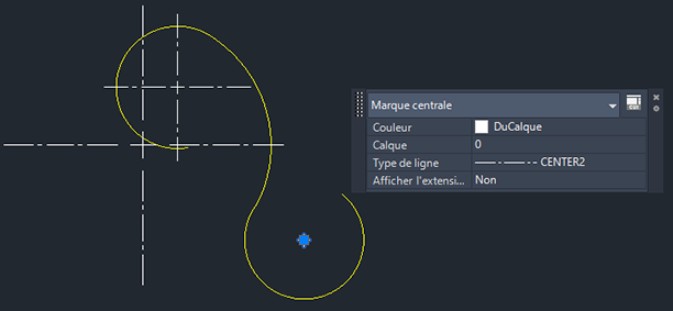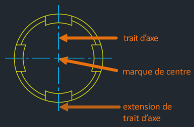 Lorsqu'un trait d'axe ou un point de centre est créé, il est placé sur le calque des traits d'axe, quel que soit le calque actuel.