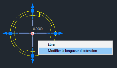 Lorsque vous placez le curseur sur la poignée centrale multifonctionnelle d'un point de centre, un menu s'affiche. Vous pouvez l'étirer pour déplacer le point de centre et modifier uniformément la longueur des quatre extensions du trait d'axe.