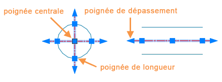 Les poignées permettent la manipulation directe des points de centre et des traits d'axe. Dans cet exemple, les traits d'axe ont été modifiés individuellement. Lorsque vous faites glisser la poignée de longueur, elle ajuste la longueur du trait d'axe et l'extension du trait d'axe se déplace avec lui. Si vous faites glisser la poignée de dépassement, seule l'extension du trait d'axe est modifiée.