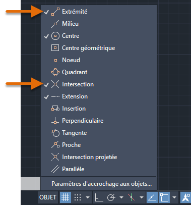 Cliquez avec le bouton droit de la souris sur le bouton Accrochage aux objets et sélectionnez Extrémité et Intersection si ce n'est pas déjà fait.