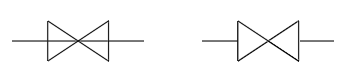 Vous pouvez créer des objets de nettoyage directement dans un dessin ou dans un bloc. Lorsqu'ils sont utilisés dans un bloc, ils permettent de gagner du temps en éliminant le besoin d'ajuster ou de supprimer la géométrie qui pourrait autrement traverser le bloc. Par exemple, l'image de gauche montre une ligne horizontale dessinée à travers le symbole de la vanne d'isolement tandis que l'image de droite masque la ligne horizontale à l'aide d'un objet de nettoyage. Aucun ajustement n'a été effectué.