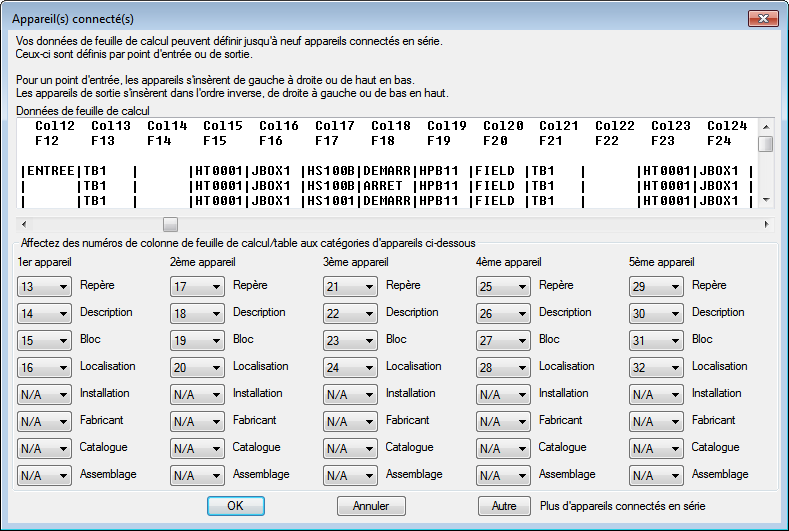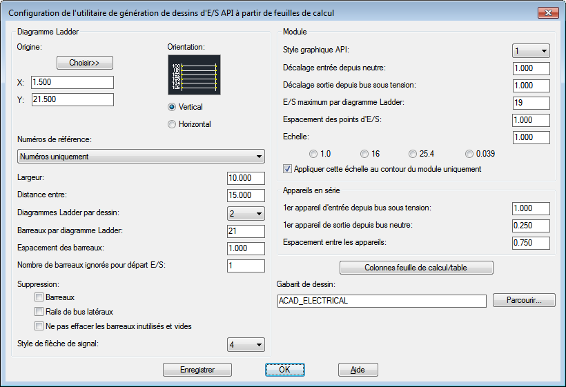 AutoCAD Electrical toolset crée un jeu de dessins d'E/S API sur la base des informations de la feuille de calcul des données API. Les diagrammes Ladder, les modules, les composants en ligne et les fils sont insérés automatiquement.