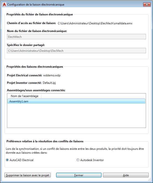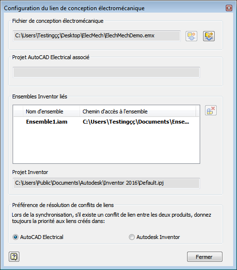 Créez un projet électromécanique dans Inventor, puis reliez votre projet AutoCAD Electrical toolset au fichier de liaison correspondant.AutoCAD Electrical toolset