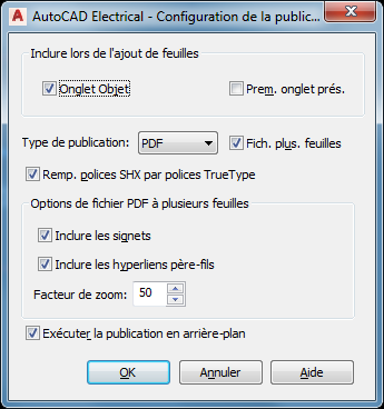 Dans la boîte de dialogue de configuration de la publication d'AutoCAD Electrical toolset, sélectionnez le type de publication PDF.
