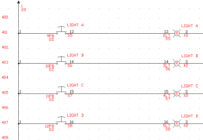Sélectionnez les lumières du bouton poussoir A à D (y compris tout le graphique et le texte) des lignes 401 à 407 (sélectionnez les objets un à un ou par fenêtre), puis cliquez avec le bouton droit de la souris