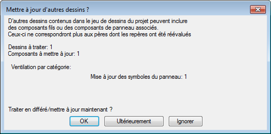 La boîte de dialogue Mettre à jour d'autres dessins s'affiche. Cette boîte de dialogue vous avertit que d'autres dessins du projet incluent des composants fils ou des composants de panneau associés.
