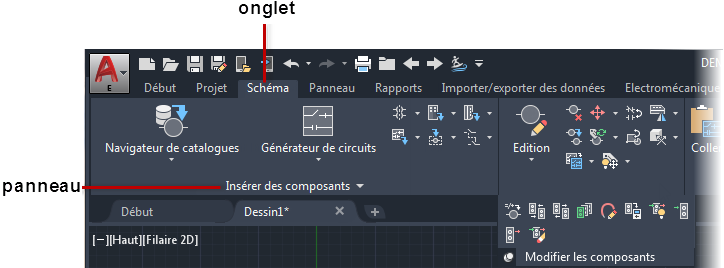 Générateur de circuits, Schéma correspond au nom de l'onglet, Insérer des composants correspond au nom du groupe de fonctions de l'onglet et Générateur de circuits correspond au nom de la commande.