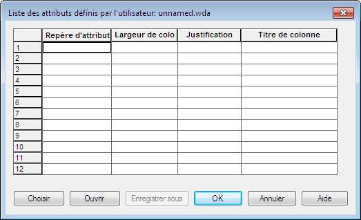 (Facultatif) Spécifiez la largeur, la justification et le titre de la colonne de l'attribut pour la génération du rapport. Si aucune valeur n'est entrée, les valeurs par défaut ci-dessous sont utilisées.