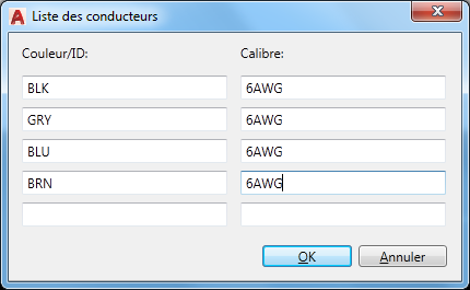 Cliquez pour ouvrir la boîte de dialogue Liste des conducteurs, dans laquelle vous ajoutez des conducteurs et définissez la couleur et le calibre de chacun d'entre eux.