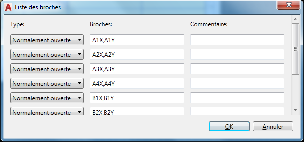 La liste des broches est enregistrée dans la base de données au format requis par le programme, par exemple 1,A1X,A1Y;2,A2X,A2Y;1,A3X,A3Y;1,A4X,A4Y;1,B1X,B1Y;1,B2X,B2Y;1,B3X,B3Y;1,B4X,B4Y.