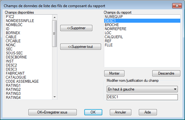 Desc1 passe dans la liste Champs du rapport. Il s'agit des champs qui s'afficheront dans le rapport des composants.