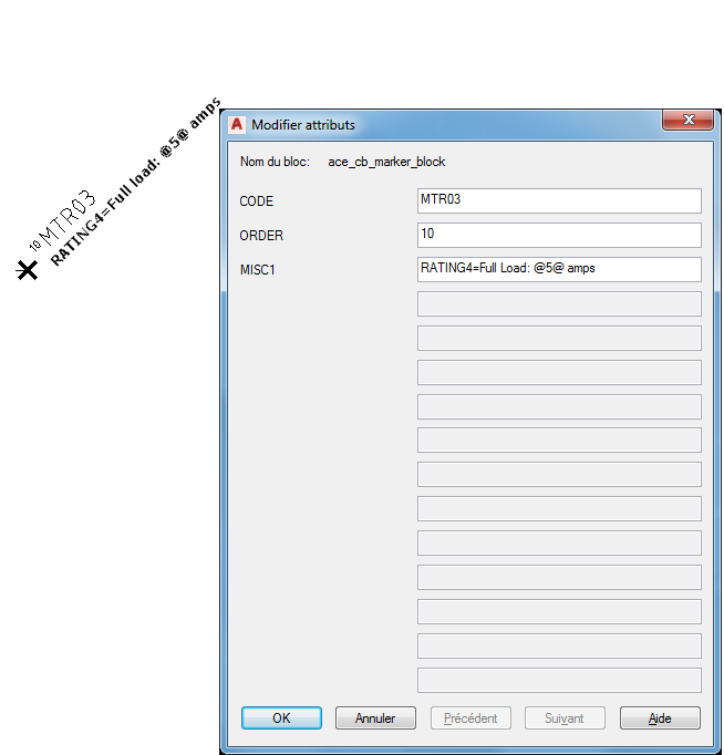 Lorsqu'un circuit moteur est sélectionné, une fonction spéciale de configuration/d'annotation du moteur est appelée. Cette fonction spéciale est signalée par un bloc de repère sur le gabarit à l'aide d'une valeur CODE qui est mise en correspondance avec une ligne de la feuille de codes du circuit portant la marque "!MCC_CTRL" dans le champ UI_TITLE. Cette fonction fait référence au fichier ace_electrical_standards.mdb pour déterminer les valeurs de courant de pleine charge et de taille de fil pour un jeu de paramètres d'entrée de moteur sélectionné.