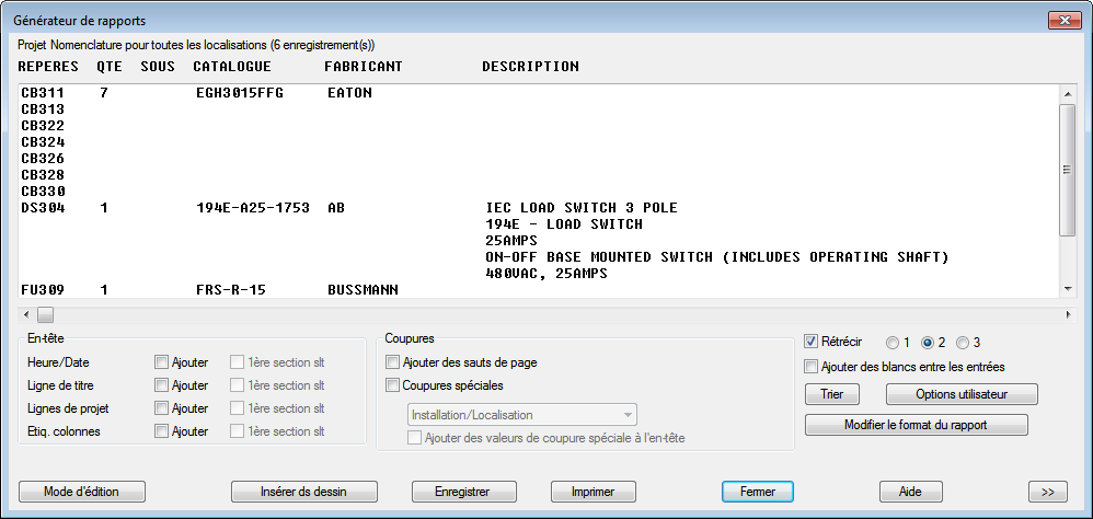 Un rapport extrait les fonctions intelligentes des dessins du projet, les met en forme, puis les affiche à l'écran.