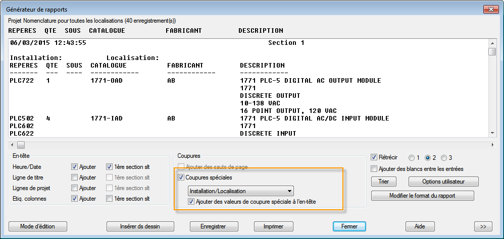 Si une entrée du rapport contient plusieurs lignes de texte, comme la description d'une nomenclature, chaque ligne de texte est considérée comme une rangée. Une table n'est pas coupée au milieu d'une entrée sur plusieurs lignes. L'entrée est déplacée dans son intégralité vers la section suivante.