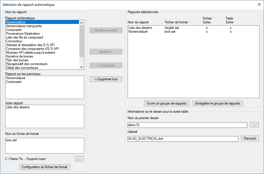Sélectionnez le nom du rapport, ainsi qu'un fichier de format (.set) pour chaque rapport que vous souhaitez exécuter. Les fichiers de format peuvent définir la sortie du fichier et/ou la sortie de la table.