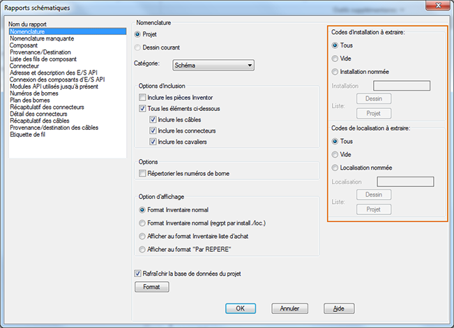 Si un rapport ne contient pas l'un des champs dont vous avez besoin, utilisez l'option Liste des attributs définis par l'utilisateur pour y ajouter des champs. Les noms d'attributs peuvent être des attributs personnalisés ayant été ajoutés à vos symboles de bibliothèque, ou des attributs AutoCAD Electrical toolset standard. Chaque nom d'attribut ajouté à la liste devient un champ disponible pour les rapports. Trouver