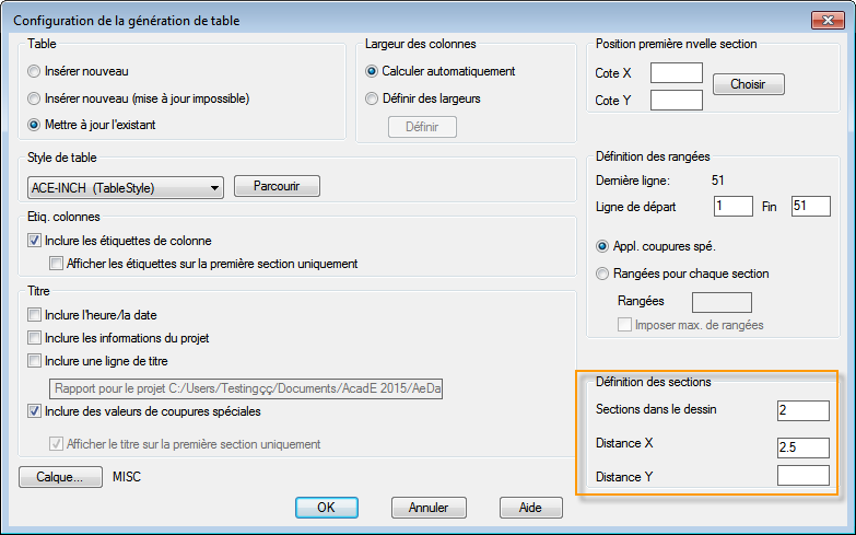 Lorsque vous avez sélectionné Coupures spéciales et cliqué sur Insérer dans le dessin, l'option Appliquer des coupures spéciales devient disponible dans la boîte de dialogue Configuration de la génération de table. Cette option insère un objet de table pour chaque section en fonction des coupures spéciales.