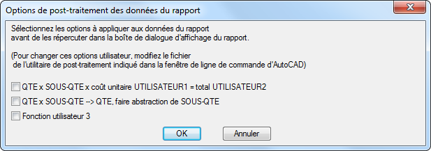Chaque type de rapport est associé à un fichier LISP (.lsp) et à un fichier de définition de boîte de dialogue (.dcl) qui peuvent être personnalisés pour appliquer un post-traitement aux données du rapport. Lorsque vous exécutez un rapport, les données s'affichent dans la boîte de dialogue Générateur de rapports. Si vous cliquez sur Options utilisateur, la boîte de dialogue définie dans le fichier .dcl correspondant s'affiche. Le traitement de chaque option de la boîte de dialogue est défini dans le fichier .lsp associé.
