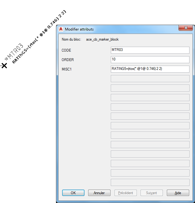 - Modifiez sa valeur d'attribut MISC1 en utilisant le format "{nom d'attribut}=(expression AutoLISP)". Par exemple, convertissez la valeur HP en kilowatts et transmettez-la à l'attribut RATING5 sur le symbole de moteur. Entrez cette expression dans l'attribut MISC1 du bloc de repère :