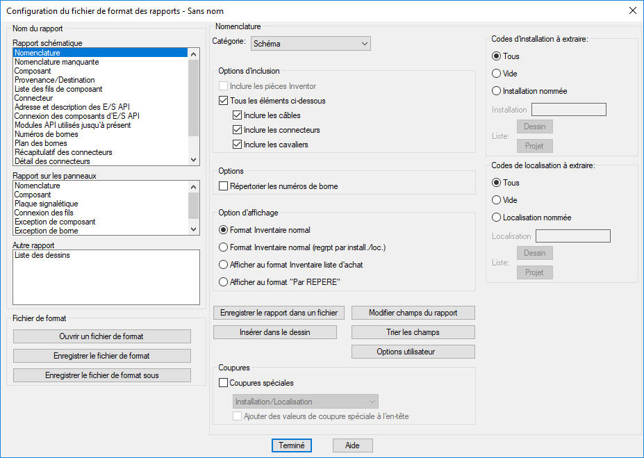 Permet d'inclure toutes les informations sur les composants schématiques qui ne figurent sur aucune présentation du panneau du rapport.
