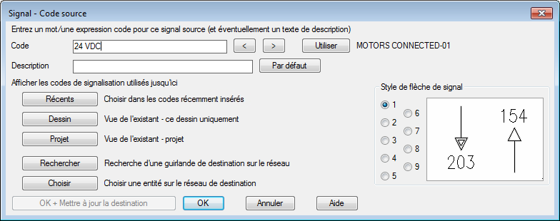 AutoCAD Electrical toolset autorise une ligne de description sur une flèche source. Cette description peut ensuite être reportée sur la flèche de destination associée. Vous pouvez définir des lignes de description par défaut pour qu'il soit plus facile de les entrer sans avoir à les taper à chaque fois. AutoCAD Electrical toolset recherche le fichier WDSRCDST.WDD. Ce fichier est un fichier texte simple dont chaque ligne est lue comme une description distincte. Si ce fichier existe, le bouton Par défaut est disponible dans les boîtes de dialogue Signal - Code source et Insérer un code de destination.