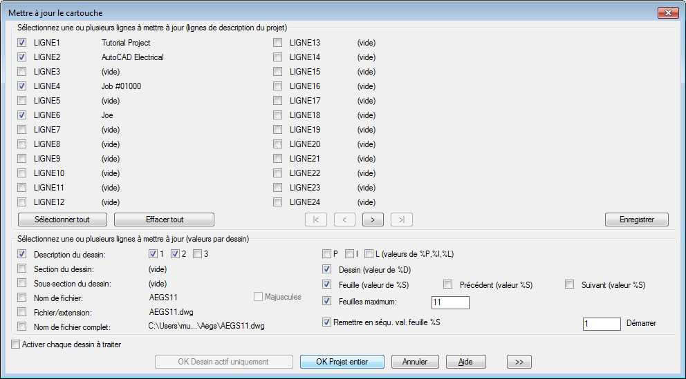 - Sélectionnez le projet et les valeurs de dessin à mettre à jour dans le cartouche.