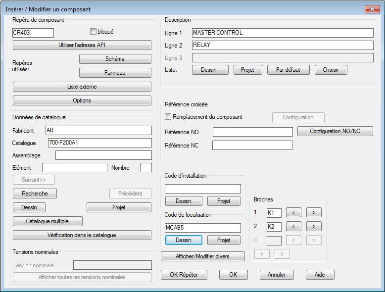 Le code fabricant et la référence catalogue sélectionnés s'affichent dans la boîte de dialogue Insérer / Modifier un composant. Lorsque vous cliquez sur OK dans la boîte de dialogue, les valeurs sont transférées au symbole.