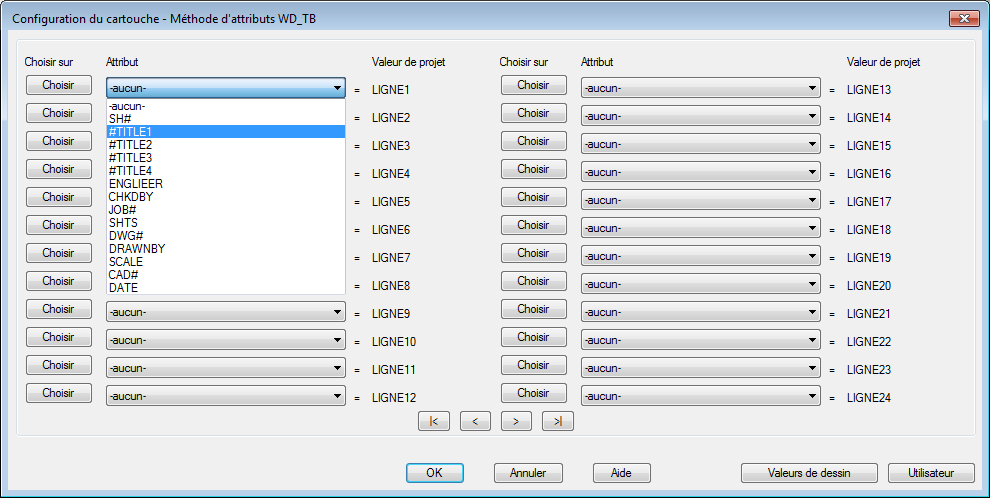 L'utilitaire Configuration du cartouche lit les définitions d'attribut. La boîte de dialogue Configuration du cartouche s'affiche. Chaque liste déroulante contient tous les objets de définition d'attribut trouvés sur le dessin.