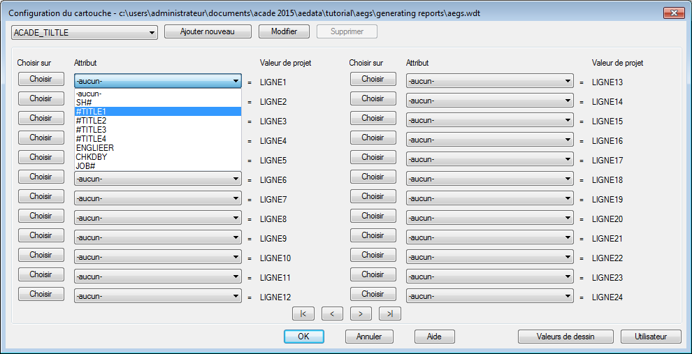Remarque : Si vous exécutez l'utilitaire Configuration du cartouche dans un dessin avec l'attribut ACADE_TITLE inséré en tant que bloc, sélectionnez l'option Choisir un bloc, puis indiquez le bloc.
