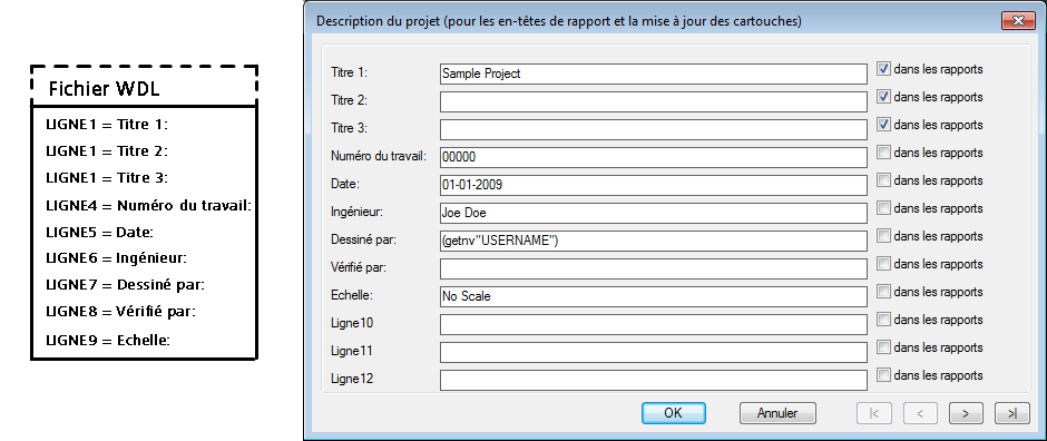 Les boîtes de dialogue descriptives des cartouches et projets dans AutoCAD Electrical toolset affichent des étiquettes génériques comme "LIGNE1", "LIGNE2", etc. Vous pouvez les modifier afin qu'elles correspondent au lien vers le cartouche. Prenons un exemple : vous avez lié la valeur "LIGNE10" des données AutoCAD Electrical toolset à l'attribut "DESSINE_PAR" dans le cartouche. Ce que vous souhaitez voir lorsqu'AutoCAD Electrical toolset affiche une boîte de dialogue liée au cartouche n'est pas "LIGNE10", mais "Dessiné par". Les étiquettes personnalisées sont définies par un fichier texte avec une extension WDL.