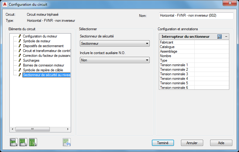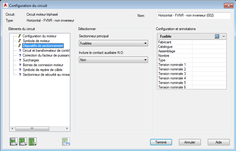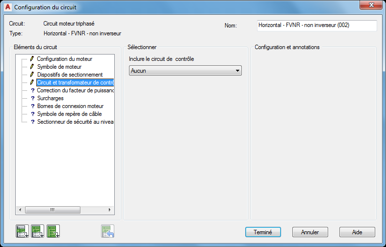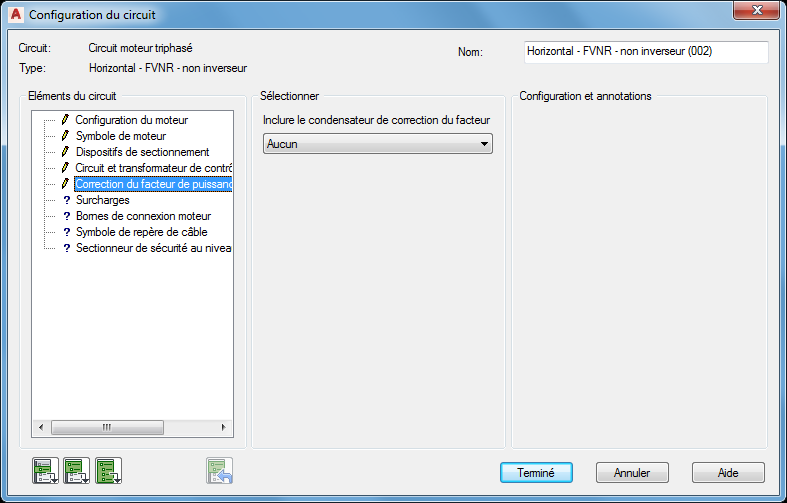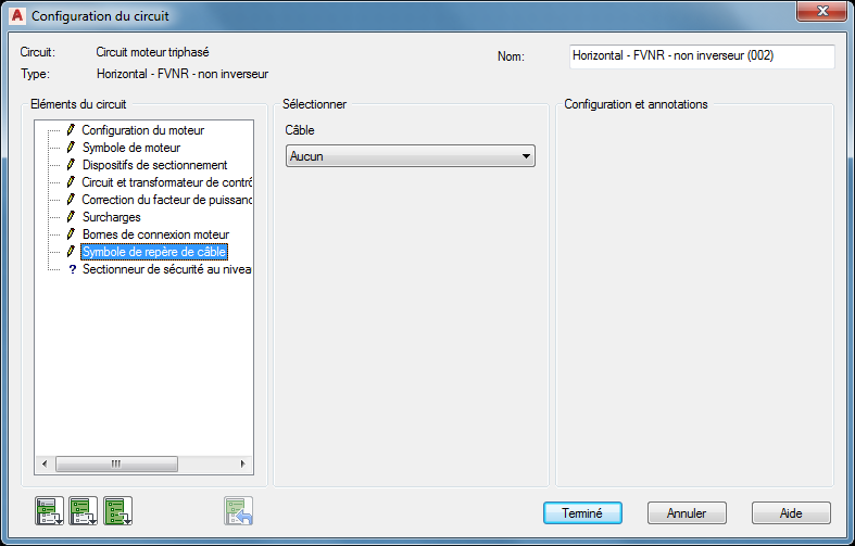 Section Configuration et annotation: Les options contenues dans cette section changent en fonction des sélections que vous effectuez dans les sections Eléments du circuit et Sélection. Entrez les valeurs ou sélectionnez le bouton Parcourir pour accéder à une table de recherche.