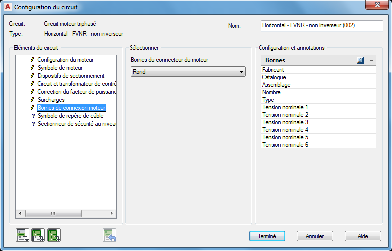 Dans la section Sélection, sélectionnez Bornes de connexion du moteur: Rond.