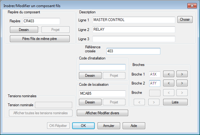 La boîte de dialogue Insérer/Modifier un composant fils apparaît. Notez qu'AutoCAD Electrical toolset n'a pas affecté automatiquement un nom de repère au contact de relais : la mention générique "CR" apparaît simplement dans la zone d'édition. Déterminez le nom de repère du contact de relais. Un contact de relais est un composant fils qui doit être lié à une bobine de relais père sur un dessin du projet actif. Le fils obtient le même nom de repère que celui de la bobine de relais père.