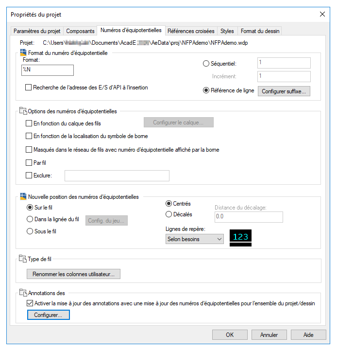 - Définir la position des numéros d'équipotentielles : au-dessus, au-dessous ou dans la lignée du fil.