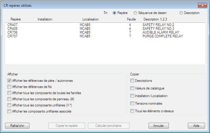 Trie la liste par repère de composant, séquence de dessin ou description.