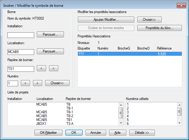 Dans la boîte de dialogue Insérer/Modifier le symbole de borne, section Borne, spécifiez :
