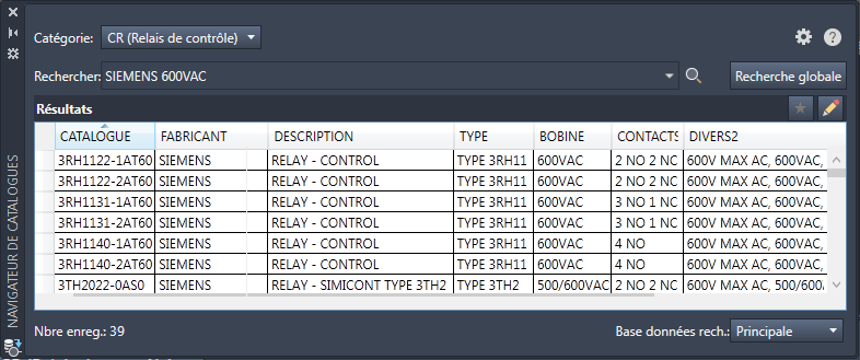 La prochaine fois que le Navigateur de catalogues utilise la table _LISTBOX_DEF pour une bobine de relais, la boîte de dialogue s'ouvre avec la recherche prédéfinie et effectuée.